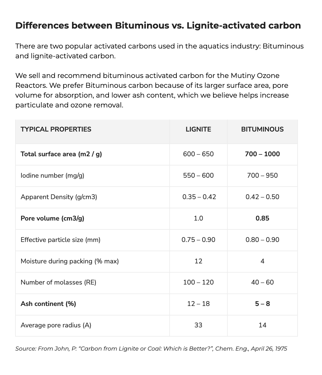 After aquarium water passes through and exits the reactor chamber, it runs through a carbon post filter which strips out all remaining ozone and any by-products of the oxidation reactions. The carbon does not "tumble", instead the effluent is dispersed evenly over the bed of GAC and then sent out the central pipe after scrubbing. This top down flow over the carbon bed has shown to be up to 20x more effective at stripping residual ozone out of the water than a traditional "upflow" fluidized reactor. This effectively neutralizes the smell in both the effluent air and water, making both safe for fish, pets, and people.