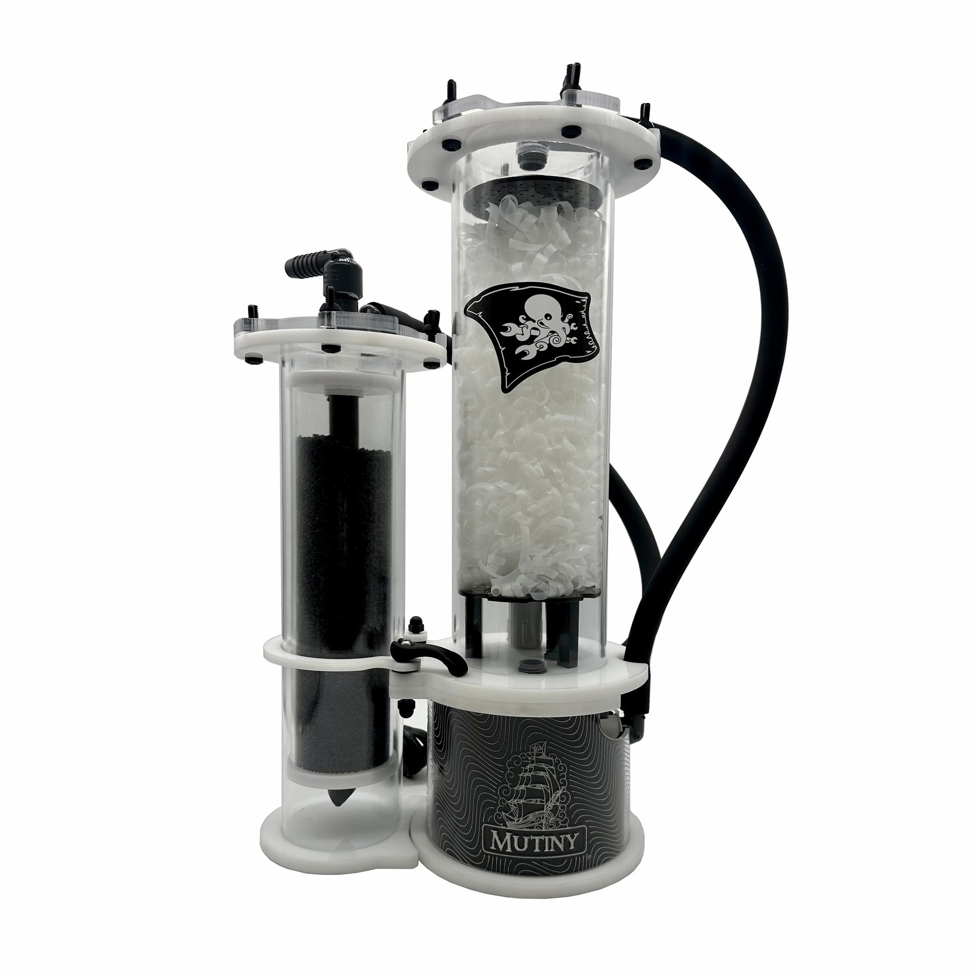 Our Mutiny ozone reactor is designed to react seawater within an ozonated air environment. The efficiency of this process is optimized by balancing water throughput with contact time, which is greatly enhanced by the use of a specially modified ozone-safe Sicce needlewheel recirculating pump.